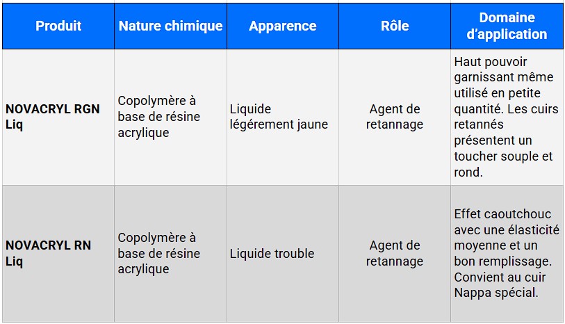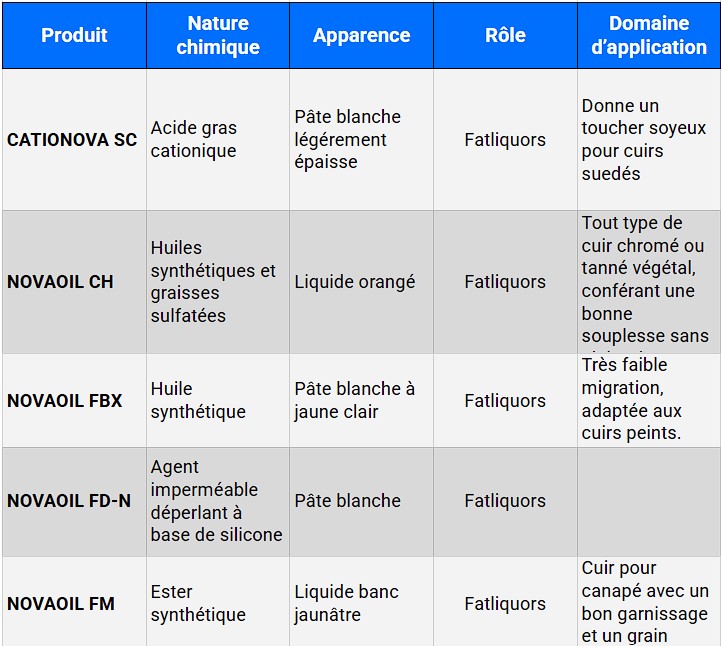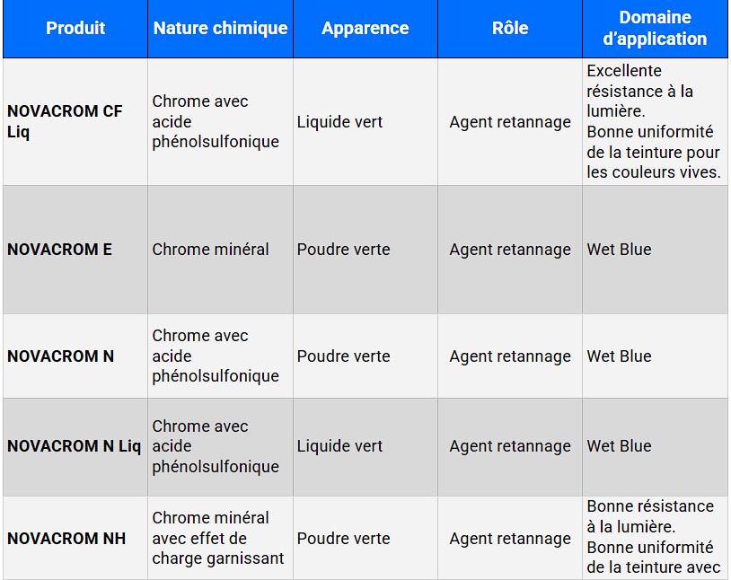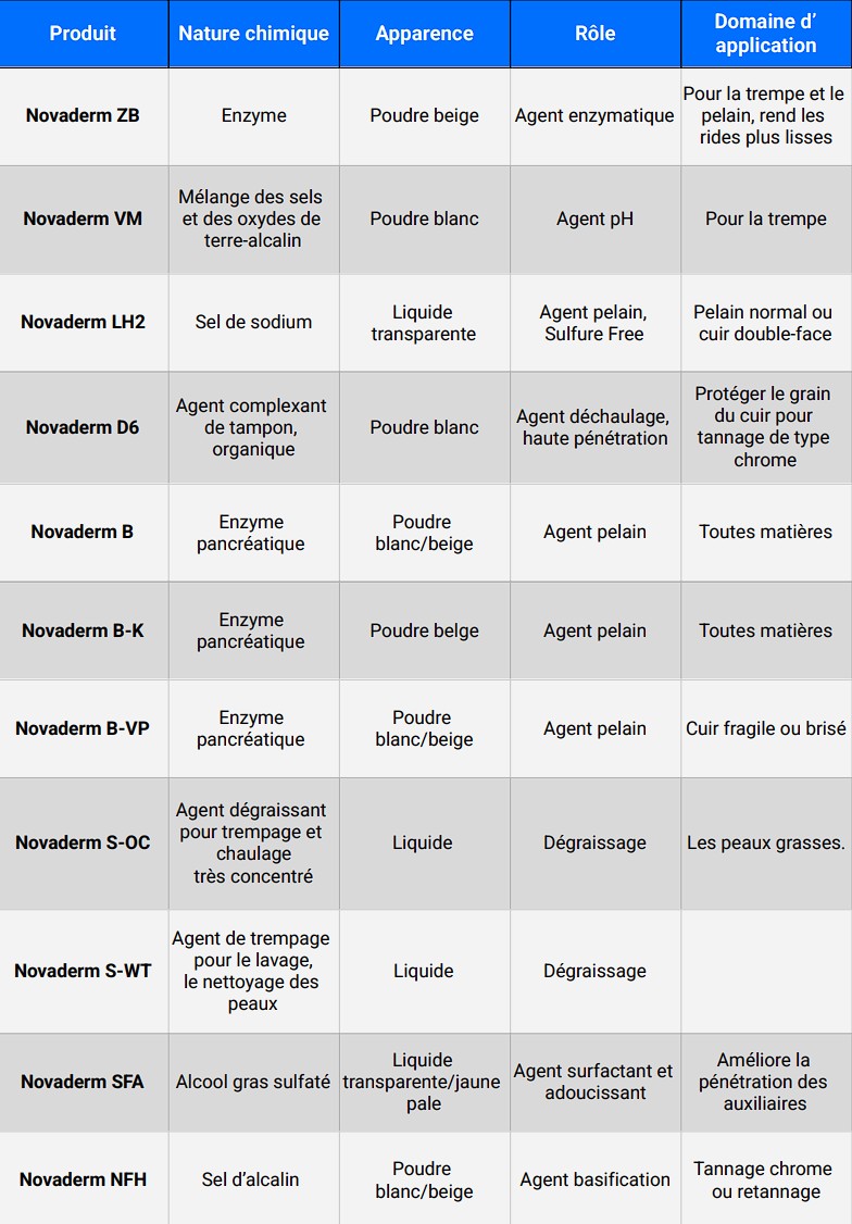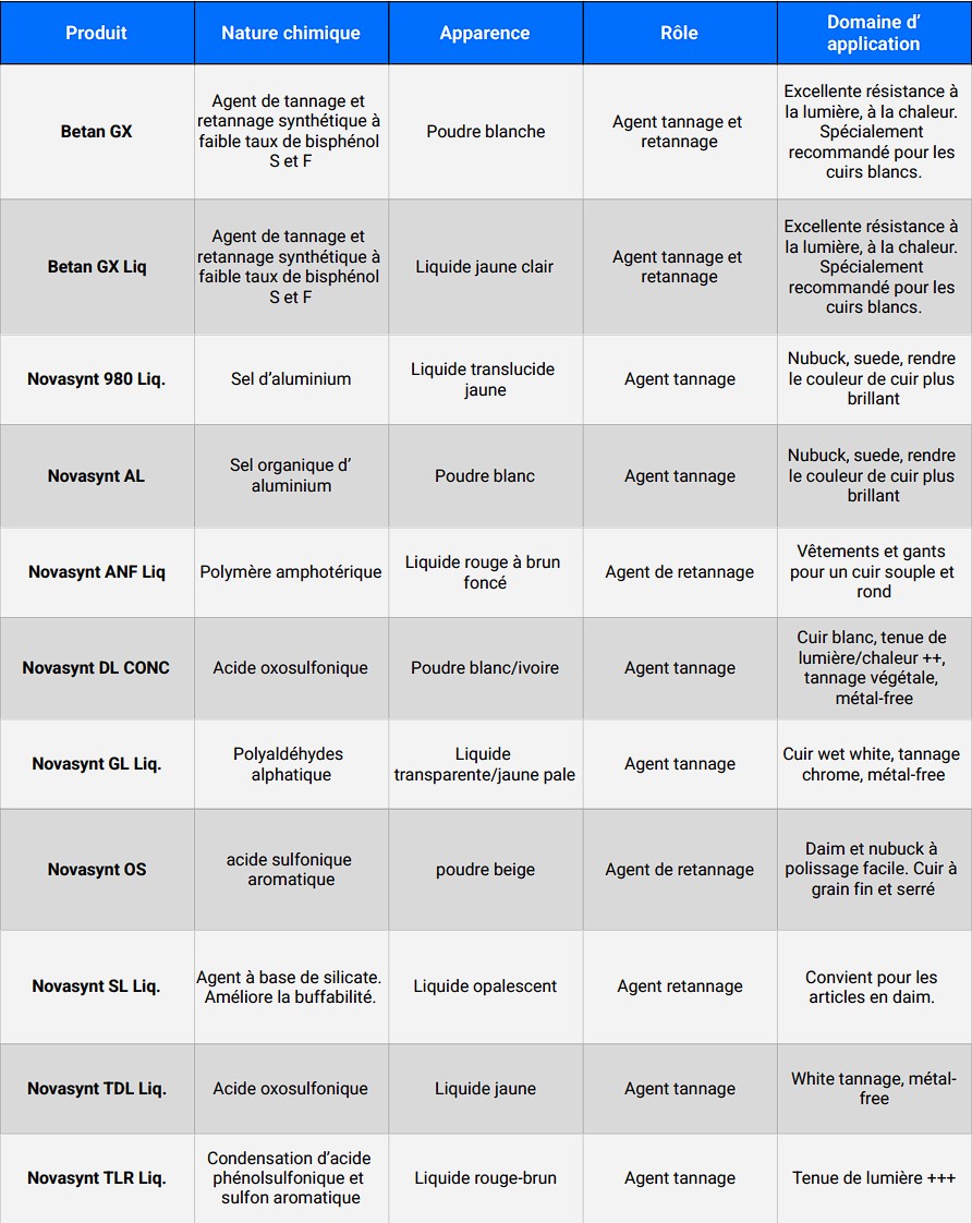 Notre large gamme inclut des produits spécifiques pour les travaux de rivière, la tannerie végétale, inorganique, synthétique et sans métaux, les agents de retannage, les colorants, les conservateurs, les agents nourrissants, ainsi que les agents de fixation et les dispersants.